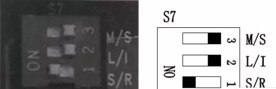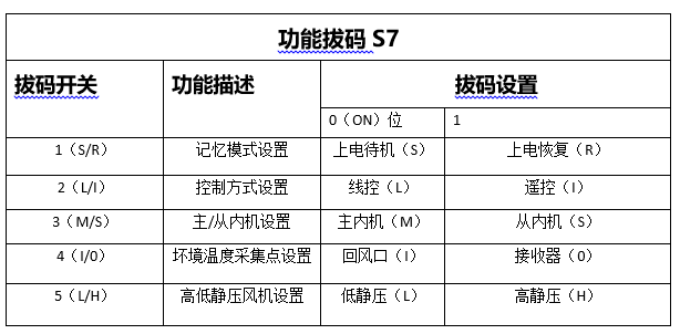當設置為線控方式時,S7上“記憶模式”設置和“主從內機”設置功能撥碼無效,該兩項設置